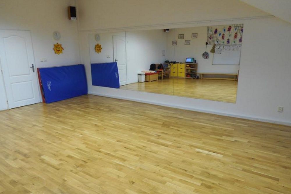Sál je vybaven zrcadly, na zemi je kvalitní podlaha. Jako obuv doporučujeme sálové taneční piškoty, případně silné ponožky. K dispozici je šatna.